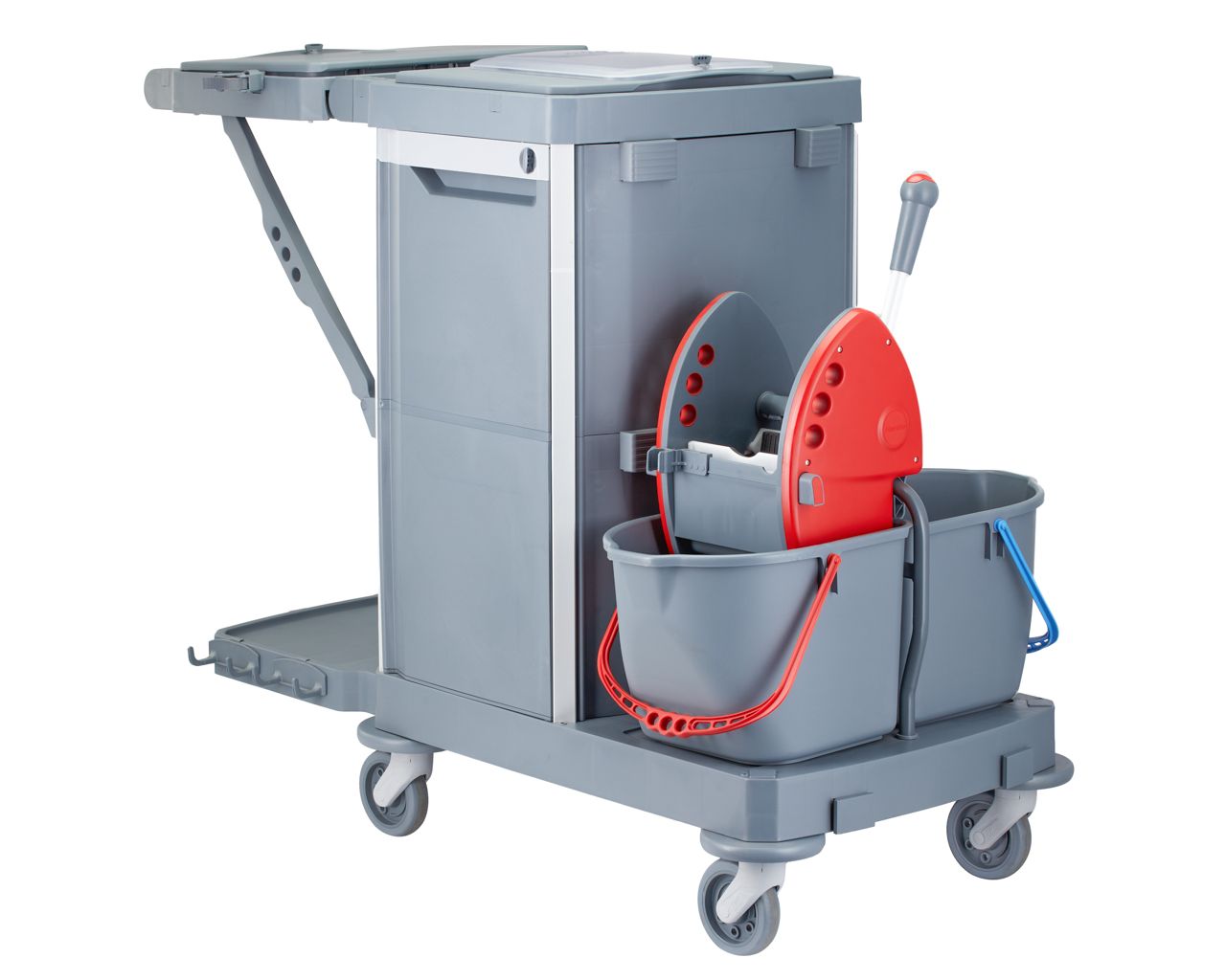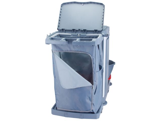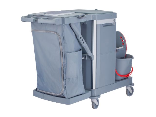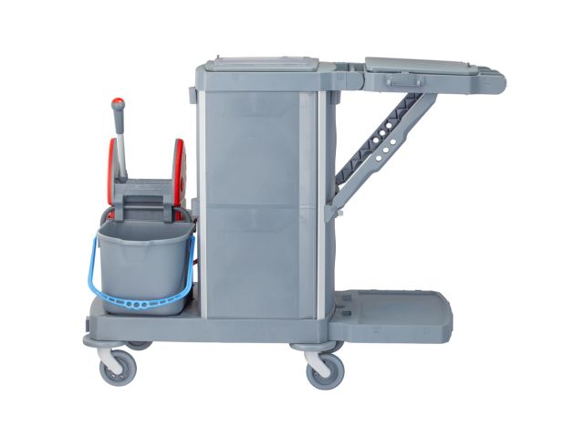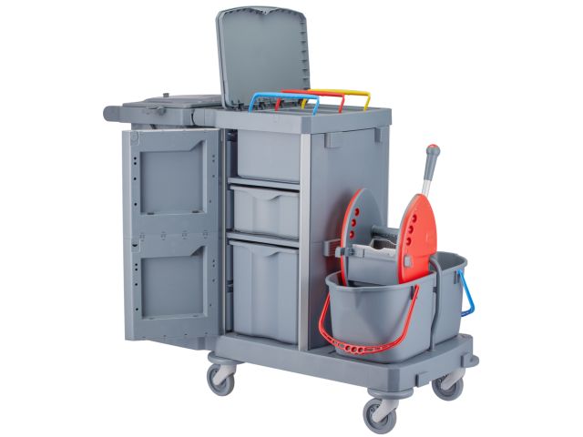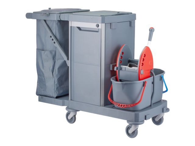 - Multifunctional service trolley designed for cleaning, waste collection, and floor and surface maintenance.