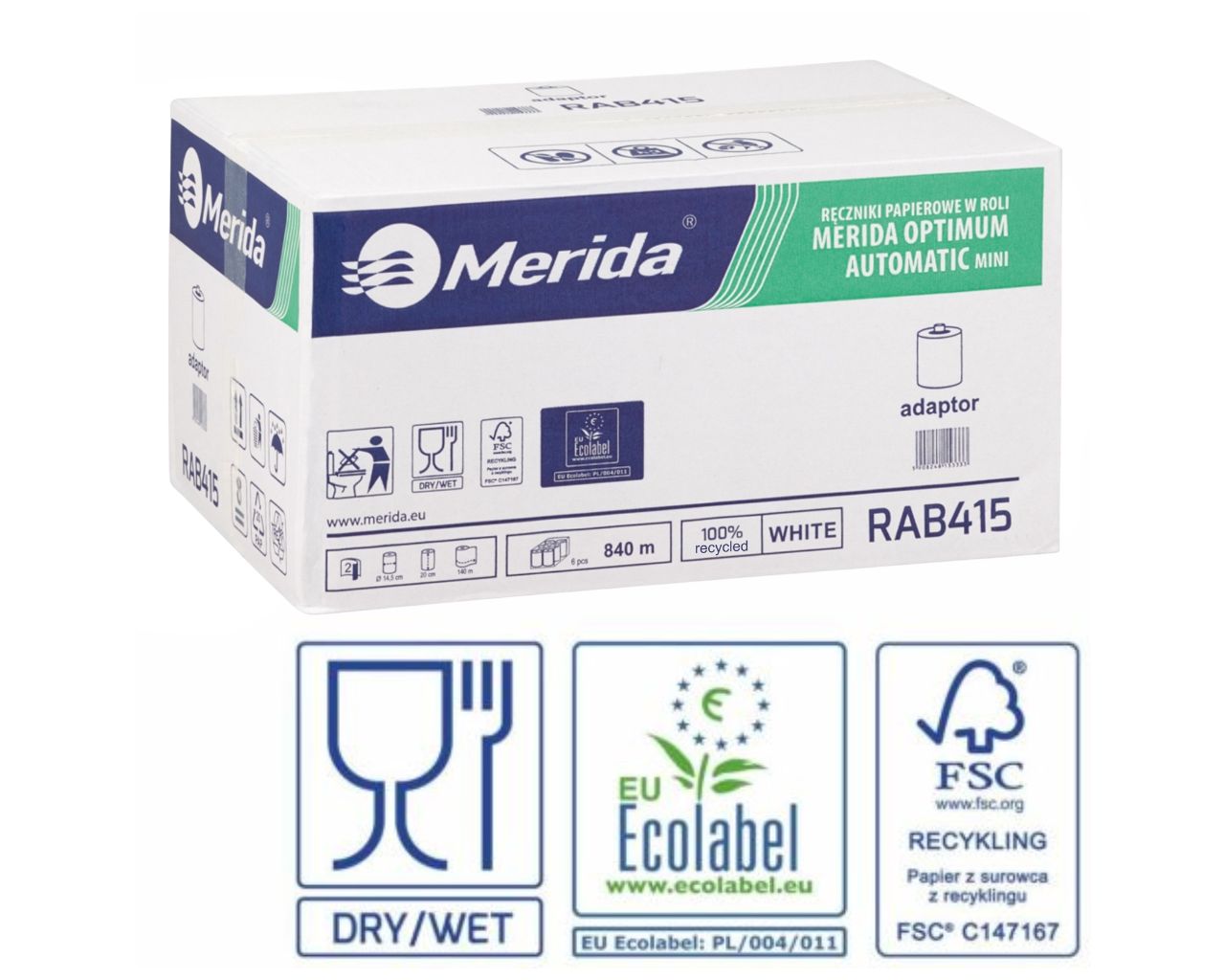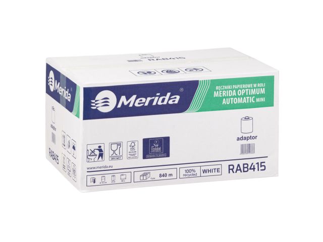 MERIDA OPTIMUM AUTOMATIC MINI roll paper towel with adapter, white, diameter 14.5 cm, length 140 m, two-ply, box of 6 rolls, ECOLABEL
