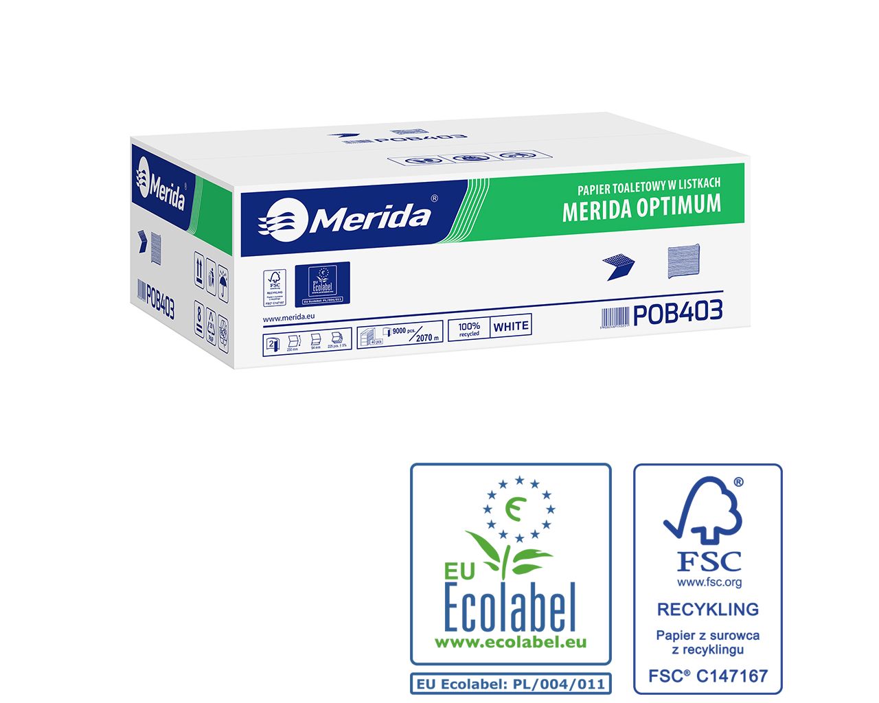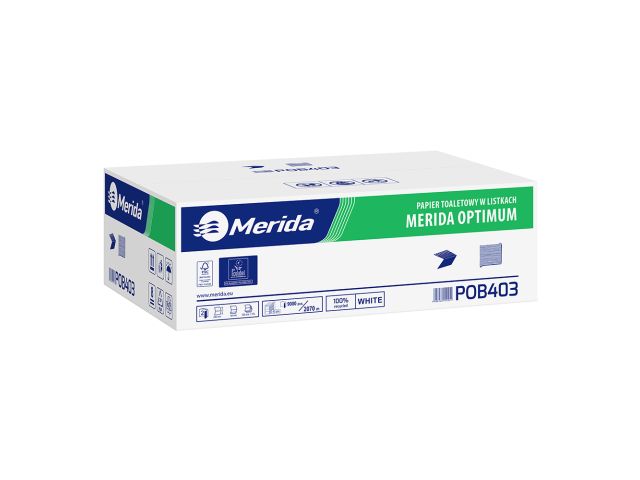 MERIDA OPTIMUM toilet paper in sheets, white, two-ply, V-folded, carton 9000 pcs. (40 packs of 225 pcs.), 2-ply, whiteness 75% ECOLABEL
