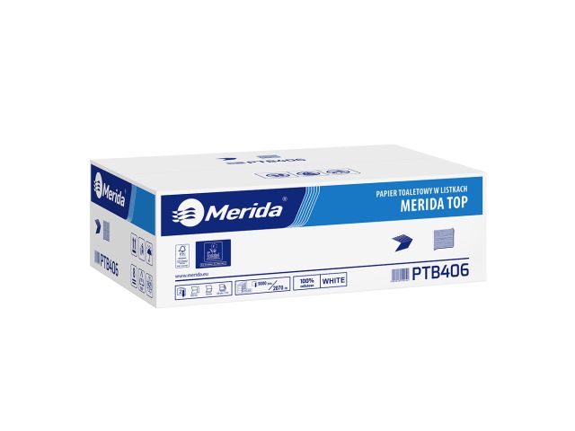 MERIDA TOP toilet paper in sheets, white, V-folded, carton 9000 pcs. (40 packs of 225 pcs.), 2-ply, cellulose, whiteness 84%, ECOLABEL
